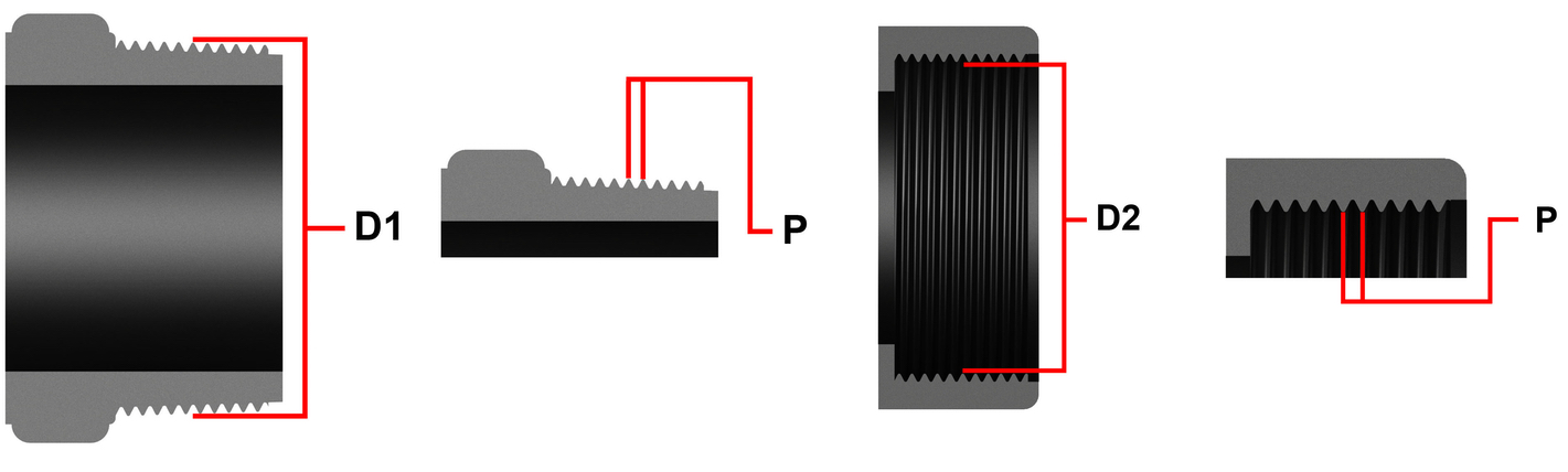 Zollgröße | D1 Aussendurchmesser mm | D2 Innendurchmesser mm | P Gewindesteigung mm |